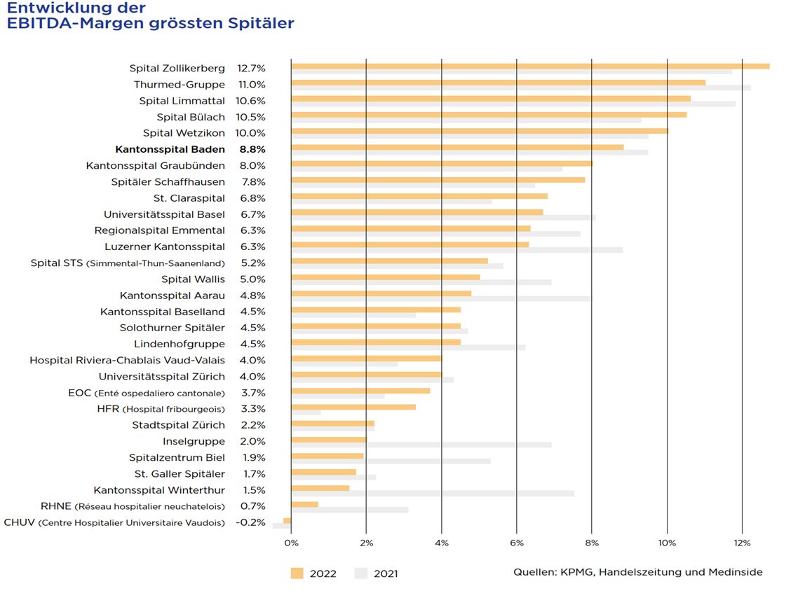 Tabelle: EBITDA Entwicklung Spitäler 2021/22 (Die Zahlen 23 fehlen noch grösstenteils)